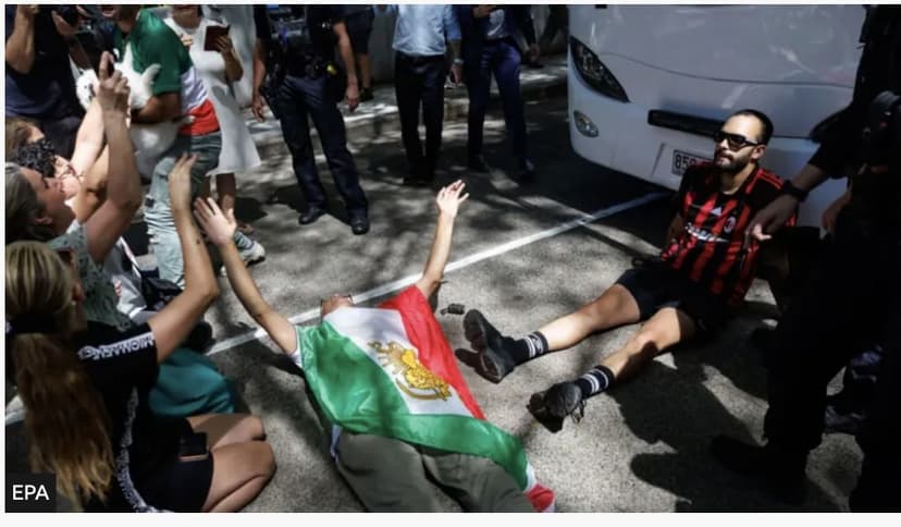 Διαδηλωτές εμπόδισαν την αναχώρηση λεωφορείου που μετέφερε την εθνική ομάδα ποδοσφαίρου γυναικών του Ιράν έξω από ξενοδοχείο στο Gold Coast της Αυστραλίας, όπου διέμεναν οι παίκτριες. Αυστραλία:…