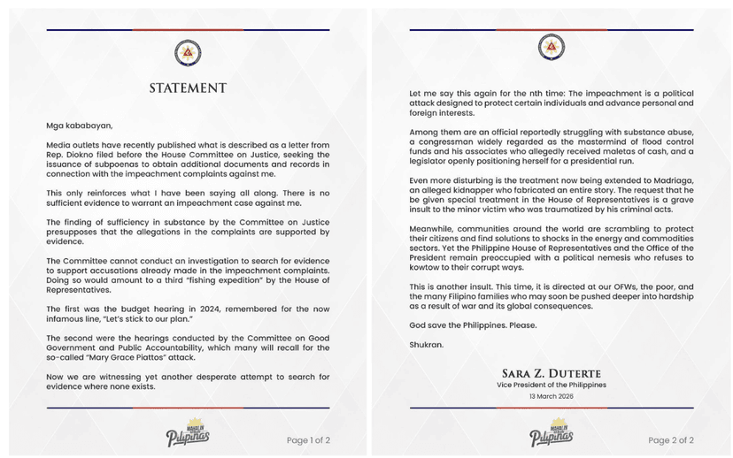 MANILA, Philippines — Vice President Sara Duterte on Friday claimed that the move by Akbayan party-list Rep. Chel Diokno to seek subpoenas in the impeachment proceedings against her only proves that the complaints lack sufficient evidence. “This only reinforces what I have been saying all along. There is no sufficient evidence to warrant an impeachment