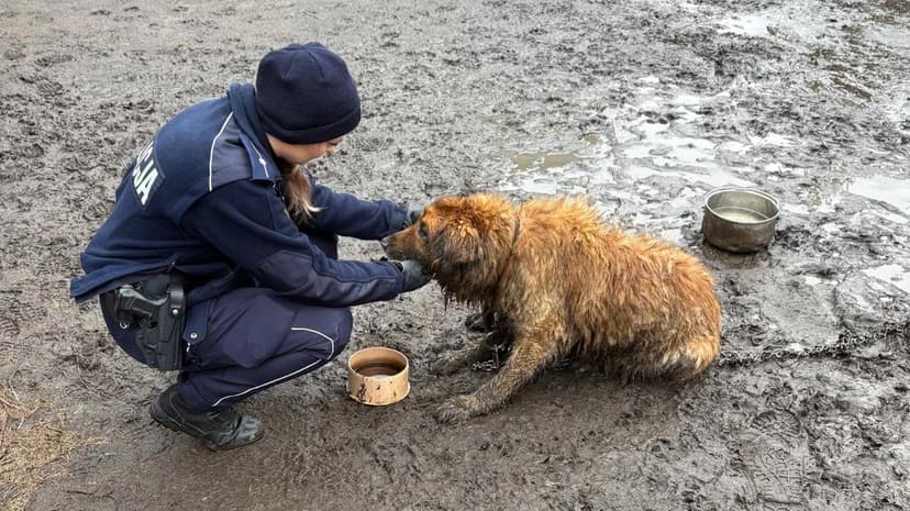 Police were called to a property in Poland after a passerby discovered a dog chained in mud, following the death of its owner. Other animals, including chickens and pigeons, were also found on the premises.