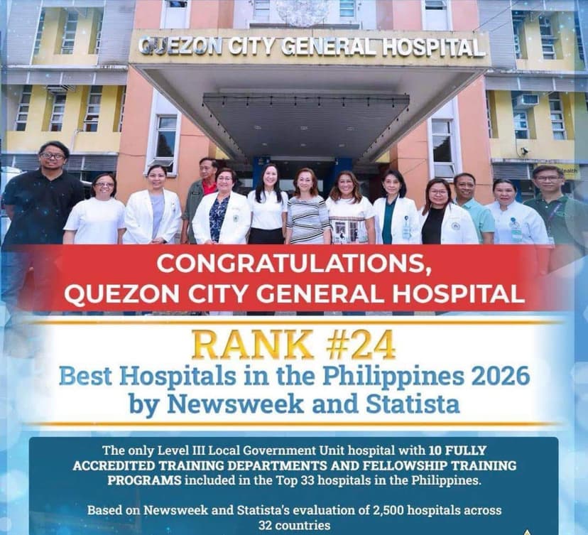 Quezon City General Hospital (QCGH) has been listed among the top hospitals in the Philippines by Newsweek magazine, ranking 24th nationwide and noted as the only Level III Local Government Unit hospital on the list.