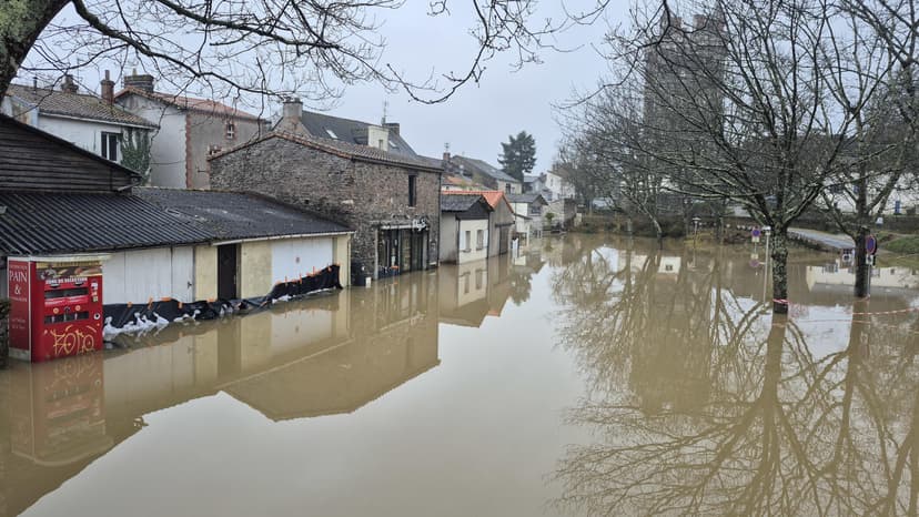 The town of Oudon in Loire-Atlantique, France, is severely affected by floods, with about a dozen businesses and services closed due to the rising Loire River, an event not seen since 1982.