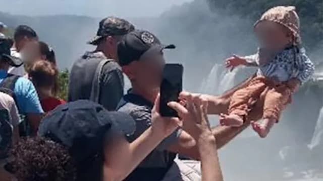 A tourist at Iguazu National Park in Brazil caused outrage by holding his infant outside protective railings over an 80-meter waterfall to take a photograph.