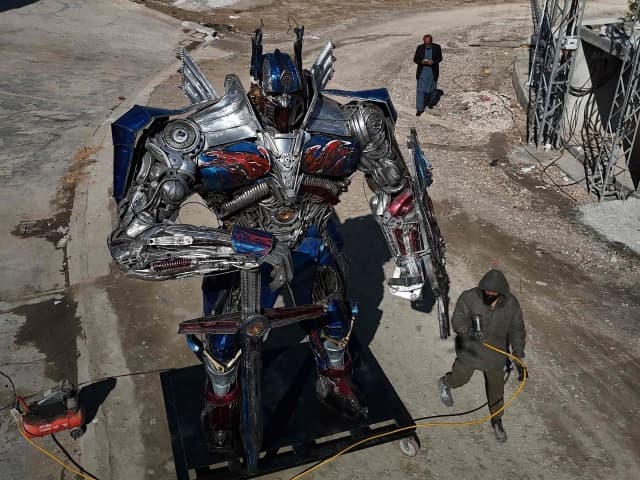 Welding sparks fly as artist crafts a 14-foot Optimus Prime from scrap
