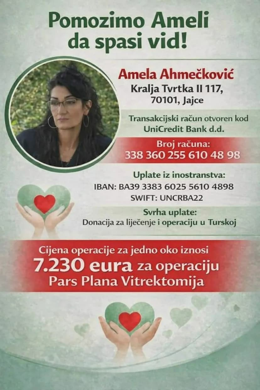 Amela Šabić Ahmečković, a 56-year-old unemployed mother and long-term diabetic from Jezero, is seeking assistance to fund an eye operation in Turkey.