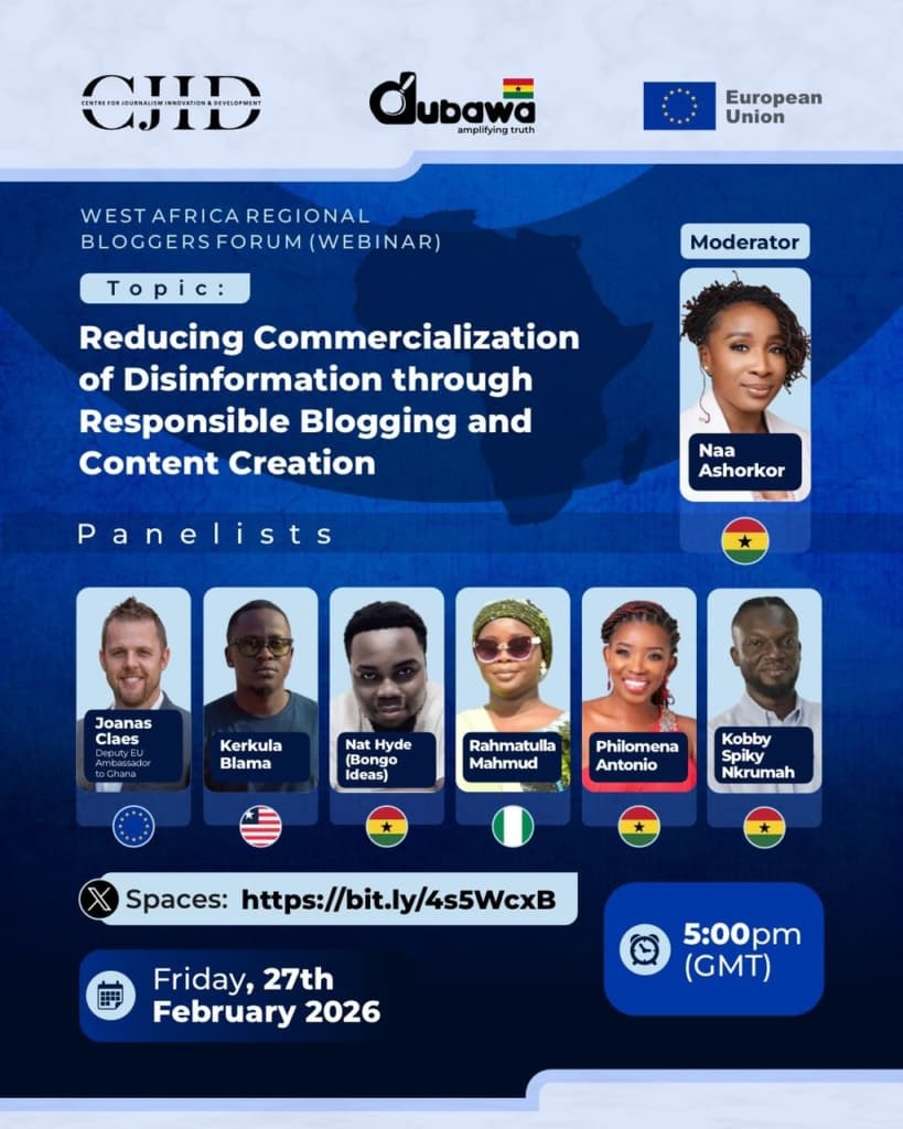 Content creators from across West Africa have pledged to promote information integrity in the sub-region at a disinformation webinar jointly hosted by the European Union (EU) in Ghana, the Centre for Journalism, Innovation and Development (CJID), and DUBAWA Ghana. The participants, bloggers, tech experts and influencers from Nigeria, Liberia and Ghana acknowledged the widespread commercialisation of disinformation on social media and committed to confronting the practice within their spheres...