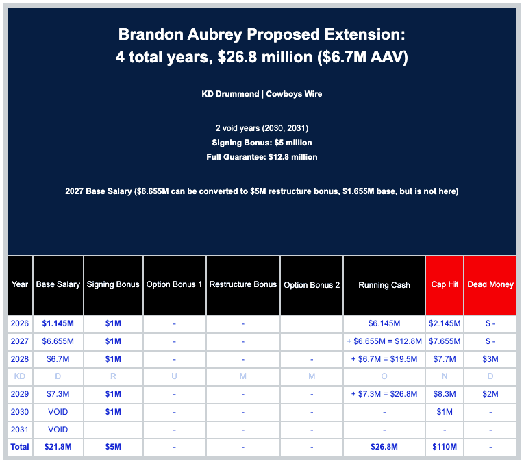 The Dallas Cowboys are advised to sign kicker Brandon Aubrey to an extension to avoid the risk of an offer sheet and ensure he remains with the team.
