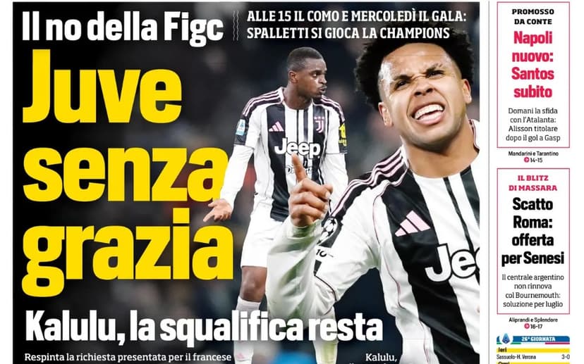 Today's sports papers cover news including no pardon for Juventus, a new Napoli, and Inter Milan's pursuit of Thuram.