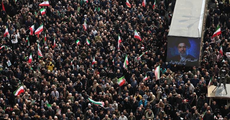 O cortejo fúnebre de importantes figuras do regime iraniano desfilou pelo centro de Teerão, acompanhado de gritos prometendo mais ataques contra "os inimigos", "morte à América" e "morte a Israel".