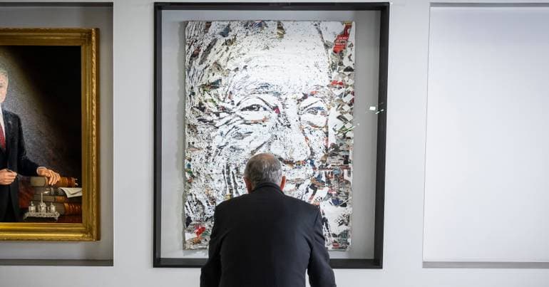 Trabalho do artista Vhils marca rutura com os retratos oficiais do passado. Em vez de uma pintura do Presidente, juntou capas de jornais da última década que formam o rosto de Marcelo Rebelo de Sousa.