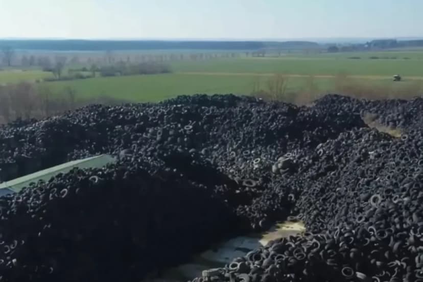Péter Magyar, a Hungarian politician, used drone footage to reveal a massive illegal tire dump in Nagykölked, Vas County, estimated to contain about 50,000 cubic meters of waste.