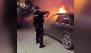 A luxury car caught fire on a street in Arad, Romania, reportedly due to an electrical short circuit. The driver managed to escape, and firefighters quickly intervened.