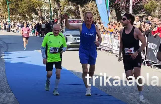 The 90-year-old runner from Trikala, Giorgos Themelis, finished the Kalabaka – Trikala half marathon for another year today, Sunday, March 15.