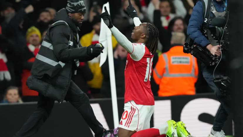 Eze fagnar einu af mörkum sínum í kvöld.AP / Frank Augstein Arsenal vann Tottenham Hotspur 1-3 í ensku úrvalsdeild karla í fótbolta. Liðið er sem fyrr í efsta sæti og með fimm stiga forystu á Manchest