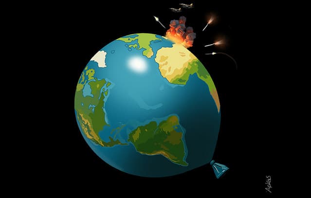 A well-known cartoonist, Arkas, depicts the dramatic developments in the Middle East, where missiles are being launched to and from Iran, and fighter jets are flying over the region, causing global concern and panic.